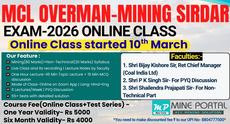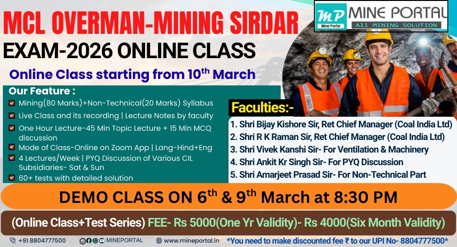 We here at MinePortal offer you DGMS Coal/Metal First Class/Second Class exam test series, Coal India Management Trainee Exam Test series, GATE mining & Other Mining exams.