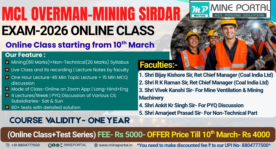 We here at MinePortal offer you DGMS Coal/Metal First Class/Second Class exam test series, Coal India Management Trainee Exam Test series, GATE mining & Other Mining exams.