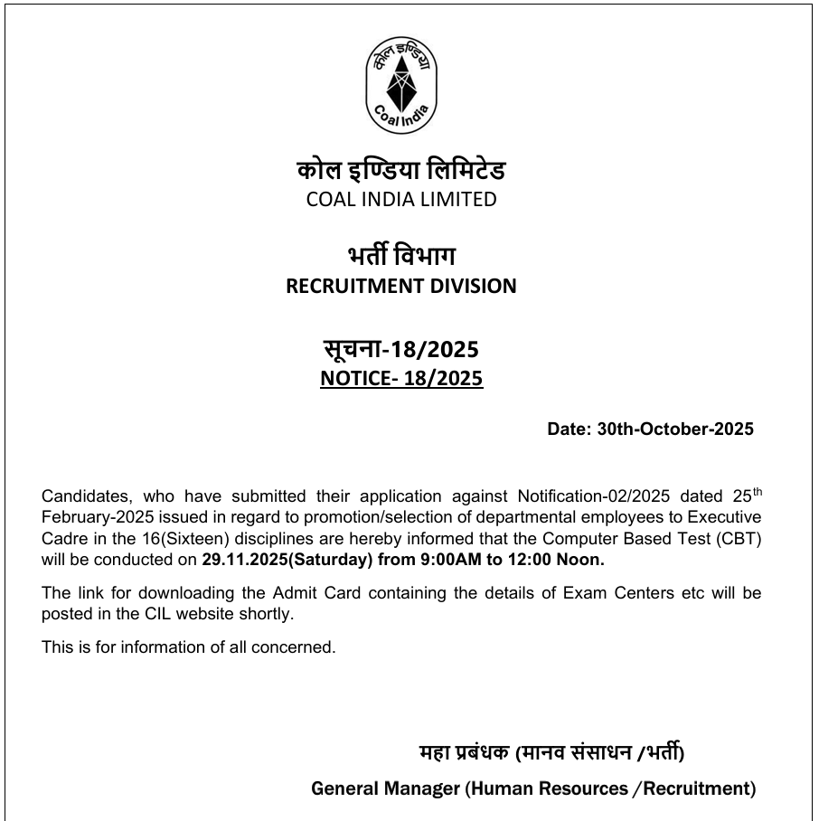 CIL CBT Exam Date 2025 Announced - Departmental Exam on 29.11.2025