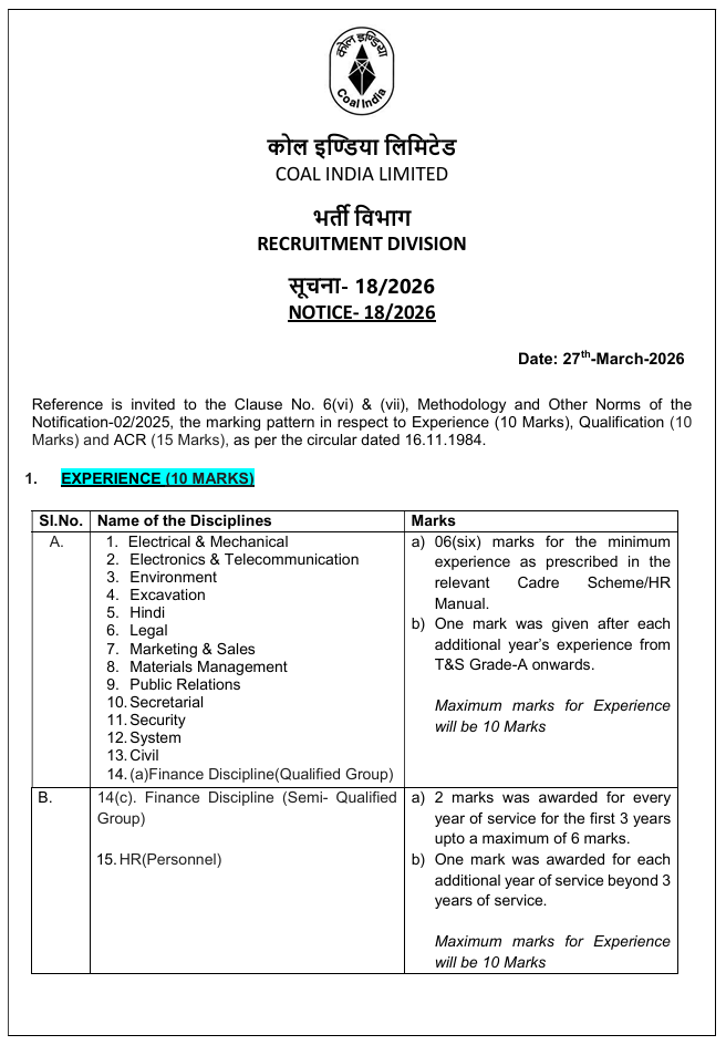 COAL INDIA Ltd. RECRUITMENT DIVISION NOTICE- 18/2026