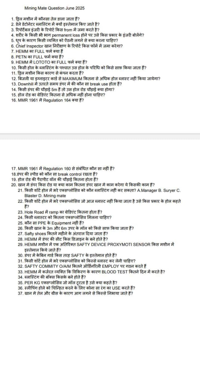 DGMS MINING MATE JUNE-2025 MEMORY BASED QUESTIONS