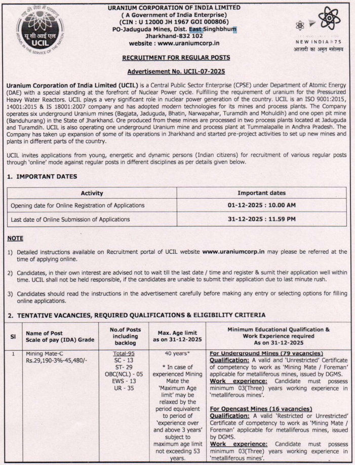 URANIUM CORPORATION OF INDIA LTD. (UCIL) RECRUITMENT-2025 FOR MINING MATE